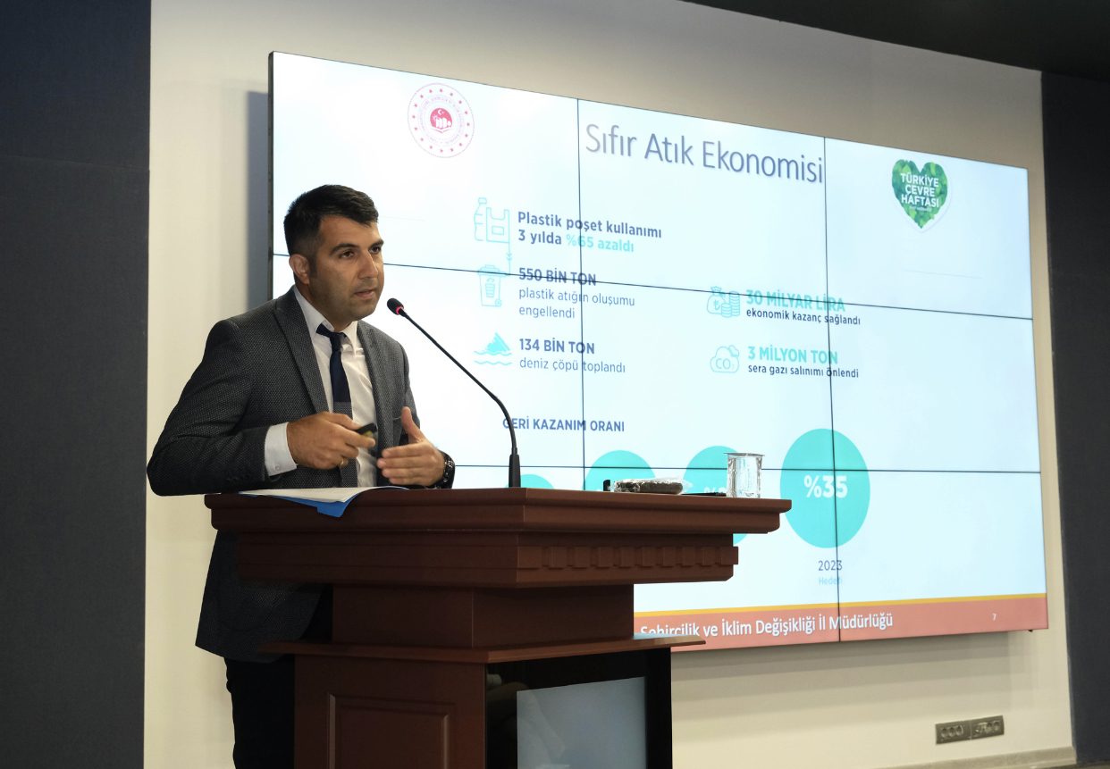 Başkan Küpeli’nin konuşmasının ardından Çevre, Şehircilik ve İklim Değişikliği İl Müdürü görevli Çevre Yüksek Mühendisi Dr. Mesut Çiftçi tarafından “Sıfır Atık: Bugün ve Gelecek” konulu bir sunum gerçekleştirildi.