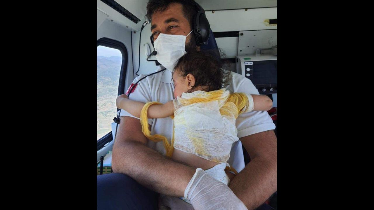 Üzerine sıcak su dökülmesi sonucu vücudunda ikinci derece yanıklar oluşan ve tedavisi için Afyonkarahisar’dan Eskişehir’e Acil Tıp Teknisyeninin (ATT) kucağında Sağlık Bakanlığı'nın ambulans helikopteri ile sevk edilen Beril bebek, hastane odasında kameralara el salladı.