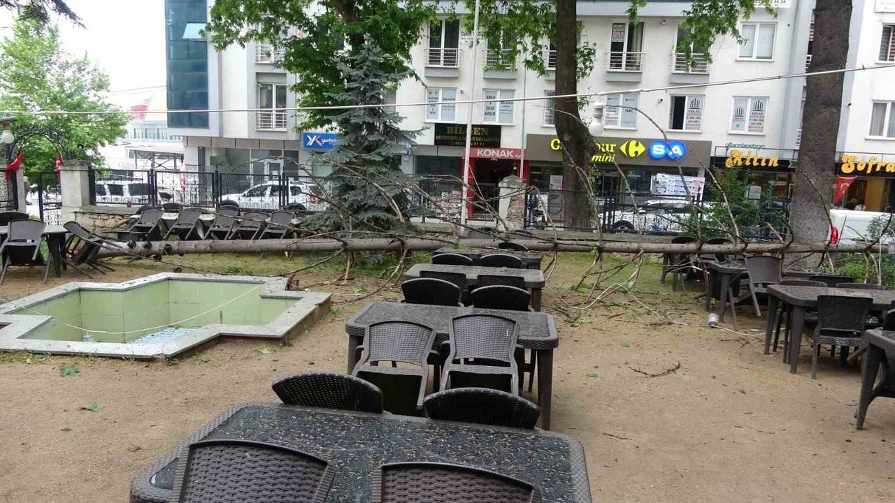 Bilecik’te bir çay bahçesinde bulunan 18 metrelik çam ağacı kökünden kırılarak devrildi.