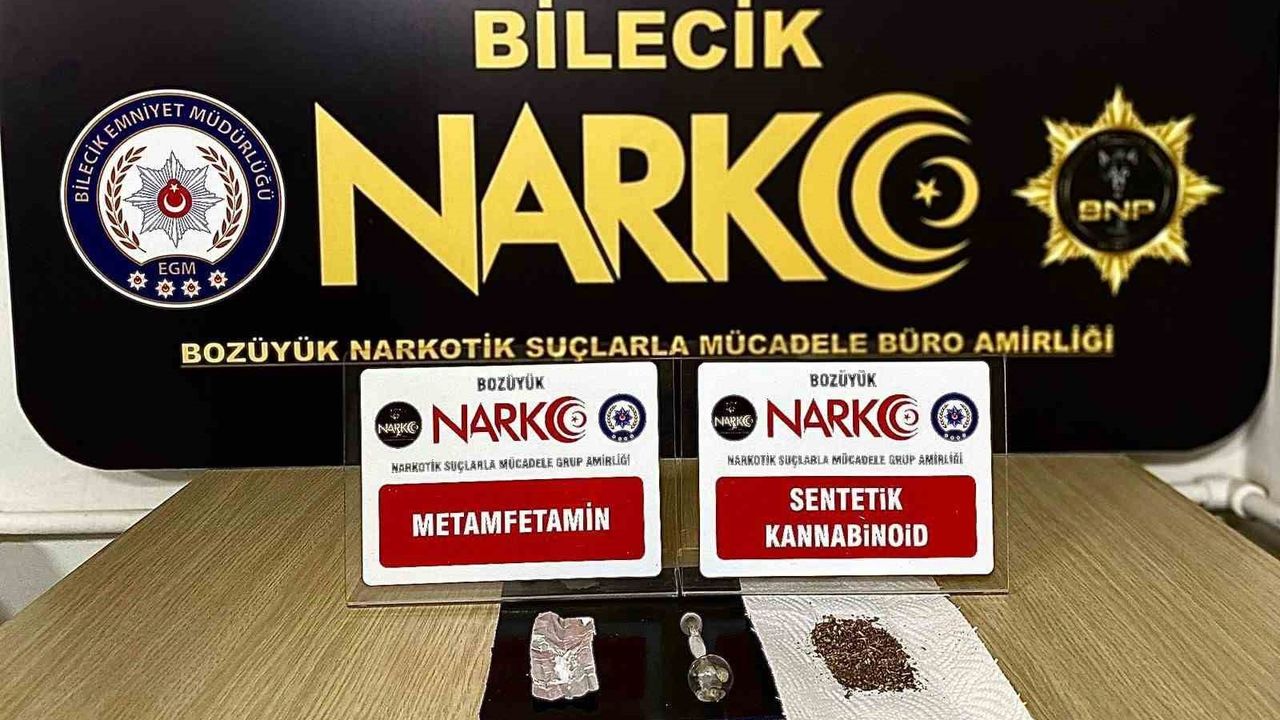 Bozüyük İlçe Emniyet Müdürlüğü Narkotik Suçlarla Mücadele Büro Amirliği ekiplerince yapılan uygulamada şüphe üzerine durdurulan araç içinde bulunan 2 kişinin narkotik suçundan aranması olduğu anlaşıldı. Şüpheli araç içerisinde yapılan aramada; 3,86 gram sentetik kannabinoid (Bonzai), 0,43 gram metamfetamin maddesi, 1 adet uyuşturucu madde kullanmaya yarayan bong aparatı ele geçirildi.