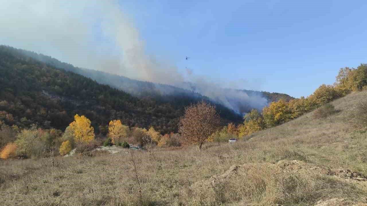 Bilecik merkeze bağlı Kurtköy ile Ahmetpınar köyleri arasında bir mevkide çıkan orman yangınını söndürmek için ekipler karadan ve havadan müdahale ediyor.