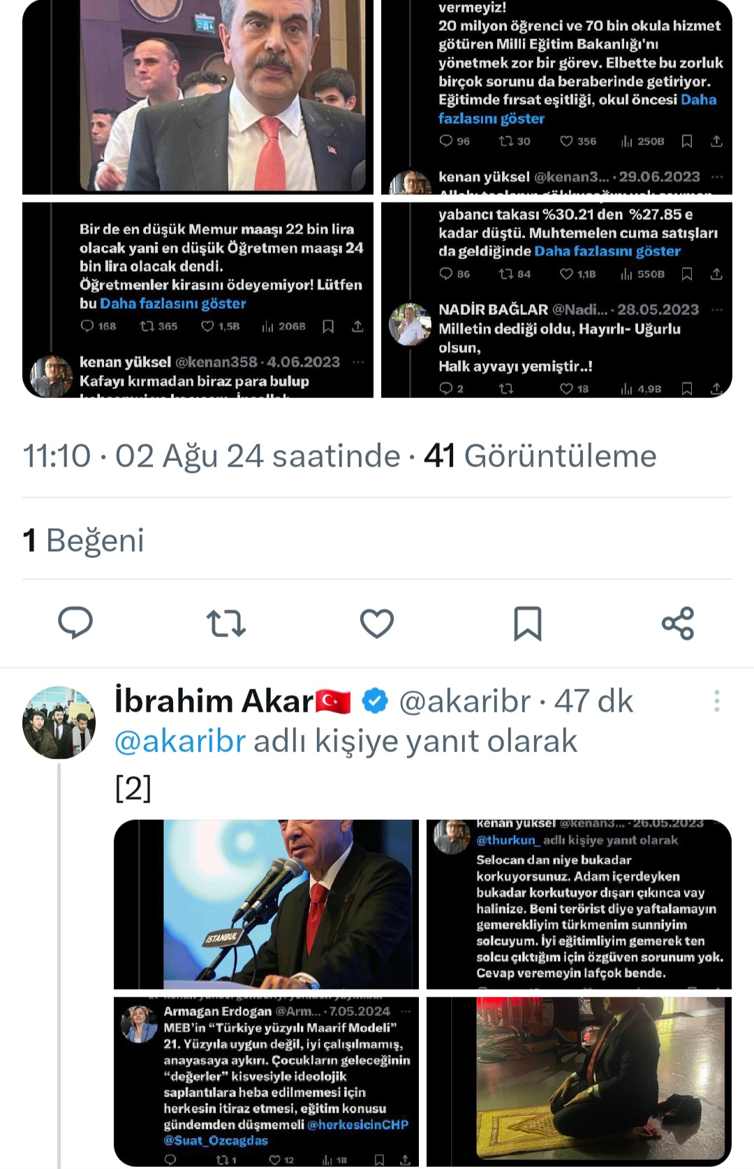 Eğitim Bir-Sen Eskişehir şube Başkanı ve Memur-Sen İl Temsilcisi İbrahim Akar; Böylesi pespaye paylaşımlar millete, milletin değer yargılarına, millet iradesine böylesi galiz hakaret ve alay edici ifadelerde bulunan birisi nasıl okul müdürlüğü yapacak nasıl yönetim sergileyecek doğrusu merak ediyoruz.