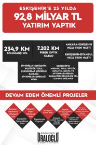 Ulaştırma ve Altyapı Bakanı Abdulkadir Uraloglu Sanal medya platformu X 'de yaptıgı açıklamada Eskişehir’e 23 yılda 92.8 milyar TL yatırım yapıldığını paylaştı.