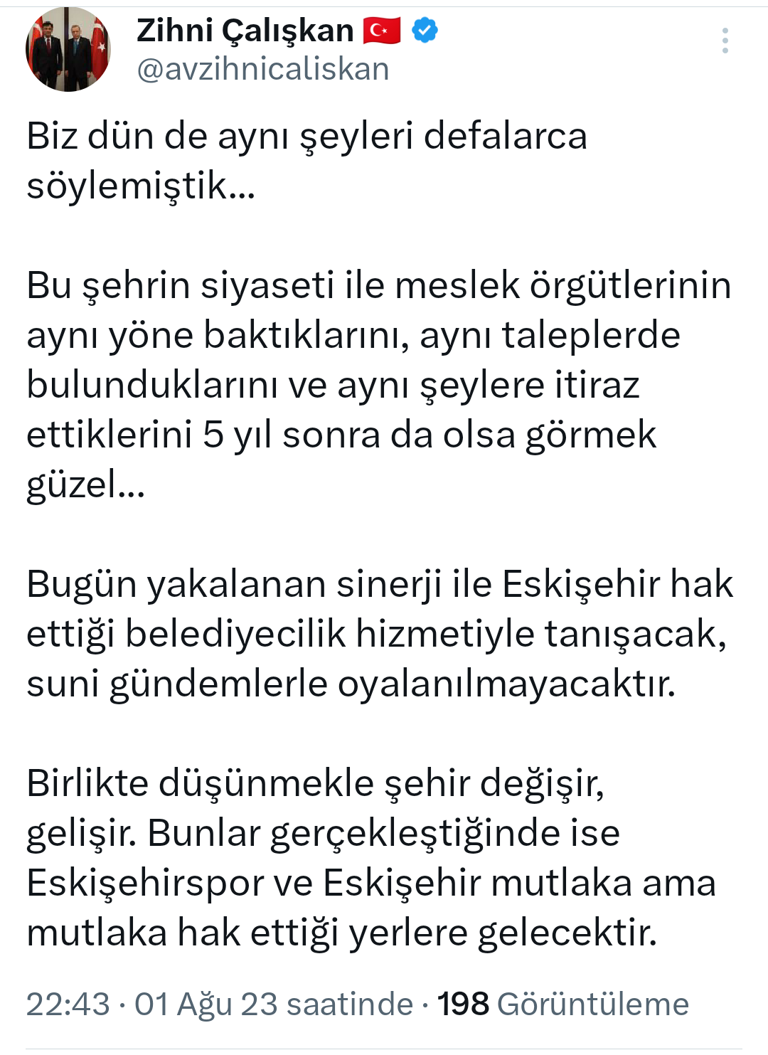 Önceki Dönem AK Parti İl Başkanı av. Zihni Çalışkan sosyal medya platformundan gündeme dair açıklamalarda bulundu.