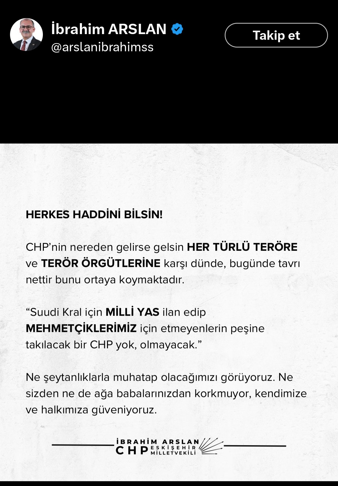 AK Parti Eskişehir Milletvekili Nebi Hatipoglu'nun TBMM'de Teröre karşı Ortak Bildiriye CHP'nin imza atmamasına verdiği tepkiyi içeren X'den yaptığı paylaşıma cevap veren CHP Eskişehir Milletvekili İbrahim Arslan’ın bir sayfalık açıklamasında Bölücü Terör örgütü pkk'nın ismini yazmaması Eskişehir kamuoyunda manidar bulundu.