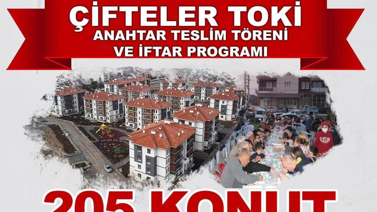 Çifteler İlçesi'nde inşa edilen 205 adet TOKİ (Toplu Konut İdareleri Başkanlığı) konutunun anahtar teslim töreni ve iftar programı düzenlenecek.