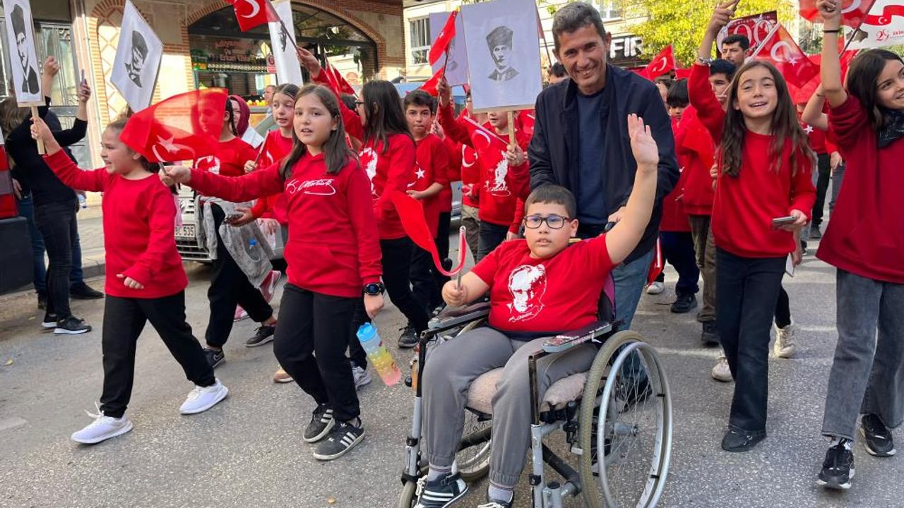 Ülke genelinde olduğu gibi Eskişehir’de de Cumhuriyet'in 100. yılı coşkuyla kutlanıyor. Tepebaşı ilçesinde bulunan Namık Kemal Ortaokulu öğrencileri yürüyüş yaparak Cumhuriyet’in 100. yılını kutladı. Bahçelievler Mahallesi Seylap Caddesi’nde yürüyen okul öğrencilerinin arasında arkadaşlarına tekerlekli sandalyesi ile eşlik eden Recep İnan, bayramın coşkusunu doyasıya yaşadı. Doğuştan yürüme yetisi olmayan İnan, babasının yardımıyla kortejde arkadaşlarıyla birlikte Türk bayrağı sallayıp marş söyledi.