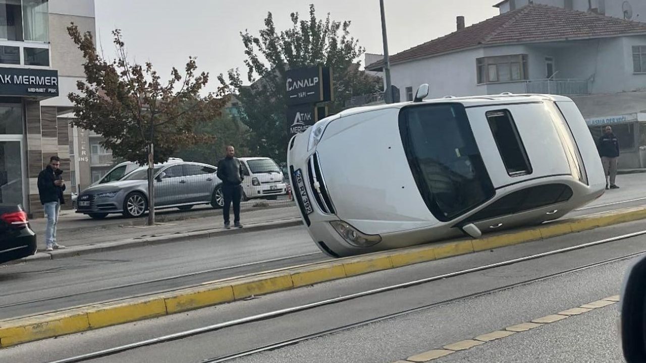 Eskişehir’de tramvay yolu üzerinde devrilen otomobil, tramvay seferlerinin aksamasına neden oldu.