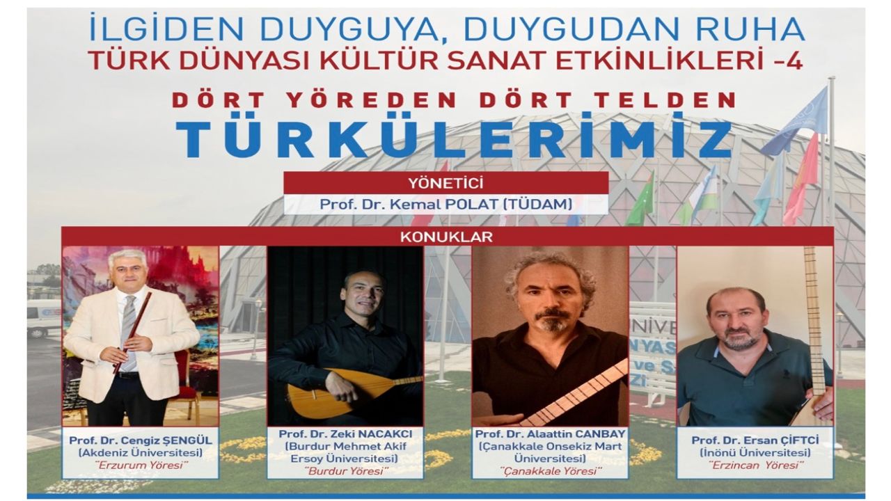 Anadolu Üniversitesi Türk Dünyası Uygulama ve Araştırma Merkezi (TÜDAM), her ay düzenlediği “İlgiden Duyguya, Duygudan Ruha Türk Dünyası Kültür Sanat Etkinlikleri” kapsamında “Dört Yöreden Dört TeldenTürkülerimiz” adlı Söyleşi ve canlı Dinleti programı düzenledi. Yöneticiliğini TÜDAM Müdürü Prof. Dr. Kemal Polat’ın yaptığı program, 26.06. 2021 Cumartesi (Bugün)saat: 21:00’de çevrimiçi olarak gerçekleşti.