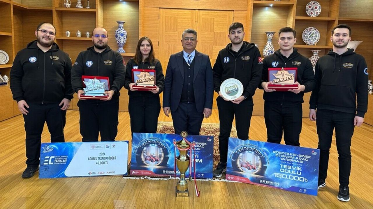 TEKNOFEST’te Robotaksi-Binek Otonom Araç Yarışması Türkiye ikinciliği, Robotaksi En İyi Tasarım Ödülü ve Efficiency Challenge Görsel Tasarım Ödülü kazanan DPÜ DUSCART ekibi, Kütahya Dumlupınar Üniversitesi (DPÜ) Rektörü Prof. Dr. Süleyman Kızıltoprak’ı makamında ziyaret etti.