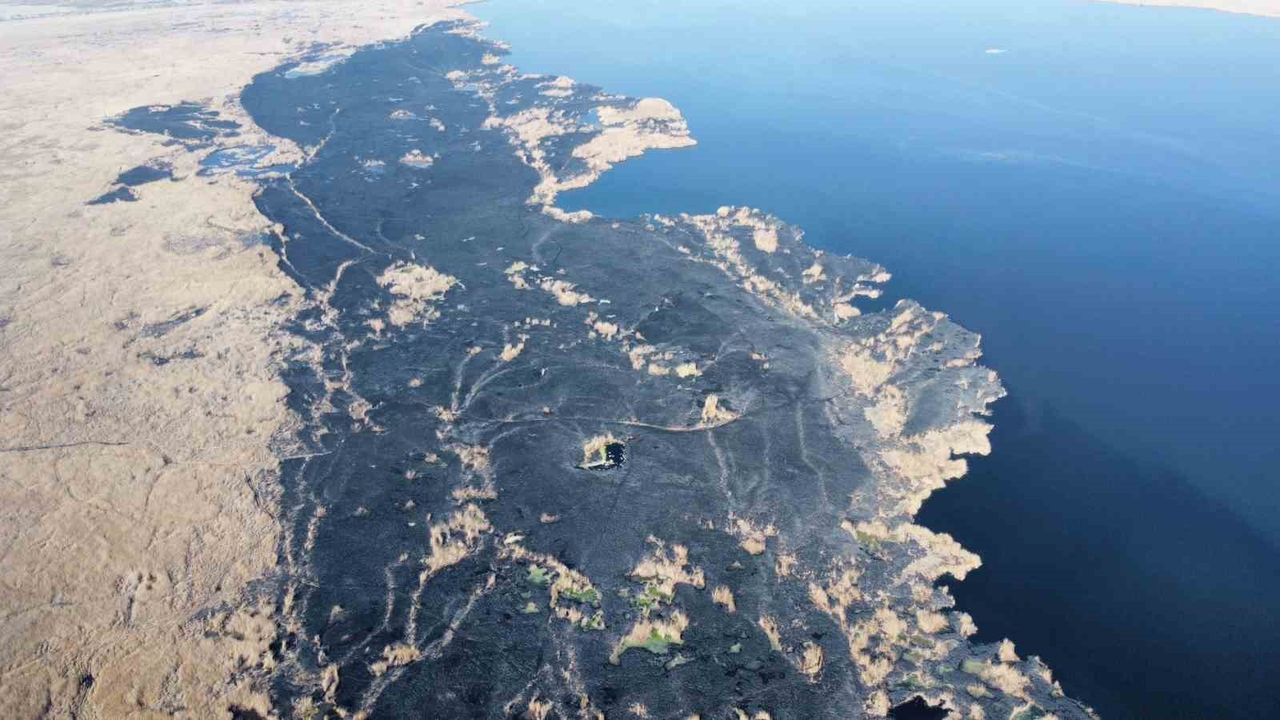 Eber Gölü’nün Afyonkarahisar’ın Çay ilçesi sınırlarında kalan bölümündeki sazlık alanda dün çıkan yangın güçlükle söndürülürken zarar gören 40 futbol sahası büyüklüğündeki alan havadan görüntülendi.