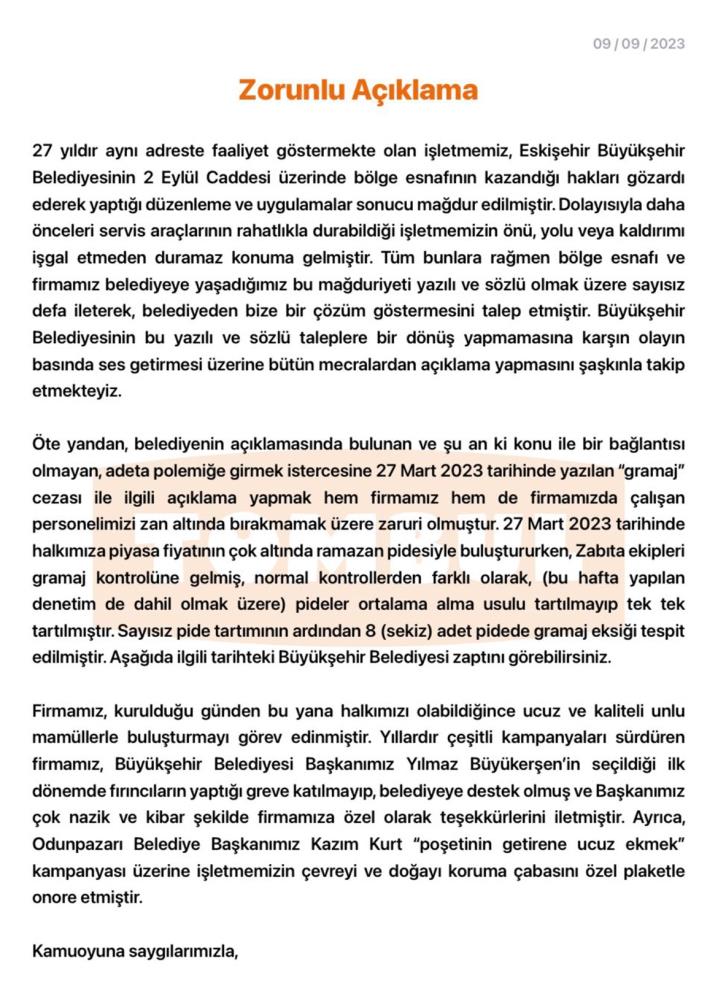 Belediye tarafından yapılan kamuoyu açıklamasındaki gramaj cezasıyla ilgili ifadelere de cevap veren işletme, “Belediyenin açıklamasında bulunan ve şu anki konu ile bir bağlantısı olmayan, adeta polemiğe girmek istercesine 27 Mart 2023 tarihinde yazılan ‘gramaj’ cezası ile ilgili açıklama yapmak hem firmamız hem de firmamızda çalışan personelimizi zan altında bırakmamak üzere zaruri olmuştur. 27 Mart 2023 tarihinde halkımıza piyasa fiyatının çok altında ramazan pidesiyle buluştururken, Zabıta ekipleri gramaj kontrolüne gelmiş, normal kontrollerden farklı olarak, (bu hafta yapılan denetim de dâhil olmak üzere) pideler ortalama alma usulü tartmayıp tek tek tartışmıştır. Sayısız pide tartımının ardından 8 (sekiz) adet pidede gramaj eksiği tespit edilmiştir. Firmamız, kurulduğu günden bu yana halkımızı olabildiğince ucuz ve kaliteli unlu mamullerle buluşturmayı görev edinmiştir” ifadelerine yer verdi.