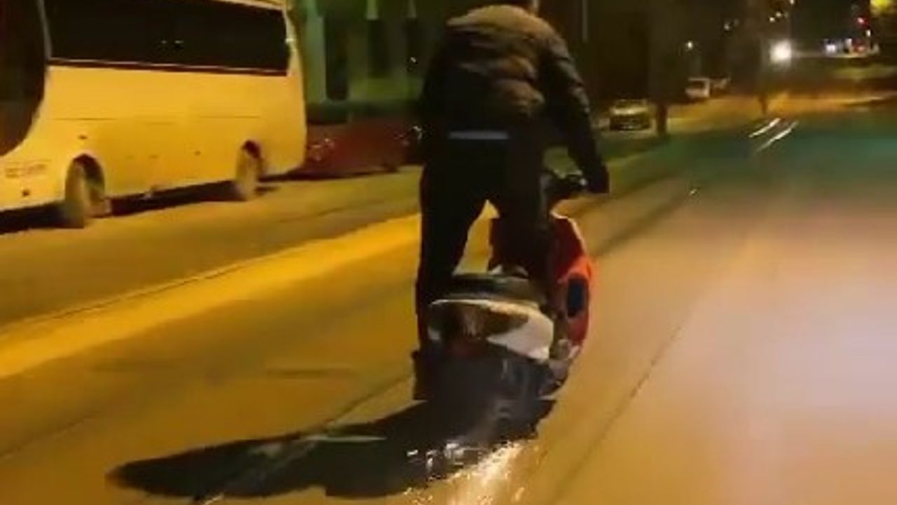 Eskişehir'de 2 genç, elektrikli bisikletleriyle yolun ortasında park ayaklıklarını zemine sürterek kıvılcımlar çıkarttı. Hem kendi canlarını hem de çevreyi riske atacak hareketler yapan gençler seyir halindeyken cep telefonunu birbirlerine vererek o anları kayıt altına aldı.
