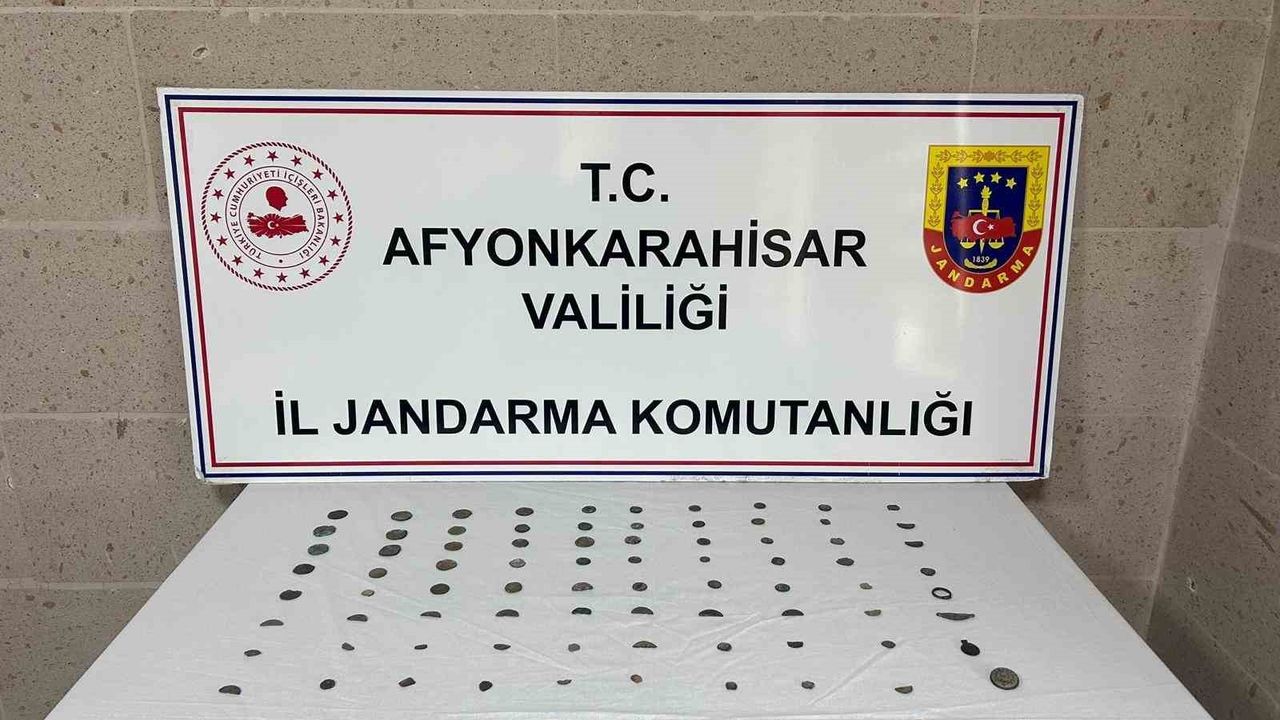 Afyonkarahisar’da elinde bulunan ve tarihi eser niteliği taşıdığı düşünülen 95 adet sikkeyi satmak isteyen şahıs jandarma tarafından gözaltına alındı.