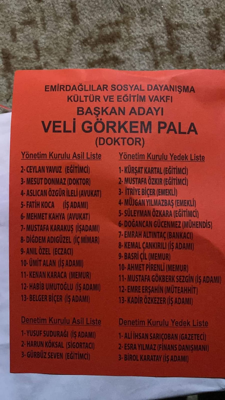 Üç adayın yarıştığı ve Divan Başkanlığını Sağlık-Sen İl Başkanı Hasan Hüseyin Köksal’ın yaptığı Emirdağlılar Vakfı seçimlerinde; Mevcut Başkan Murat Kahya’nın da desteğini alan Veli Görkem Pala 293 oy alırken Orhan Özkır 263 oy, Sibel Erenoğlu ise 70 oyda kaldı.