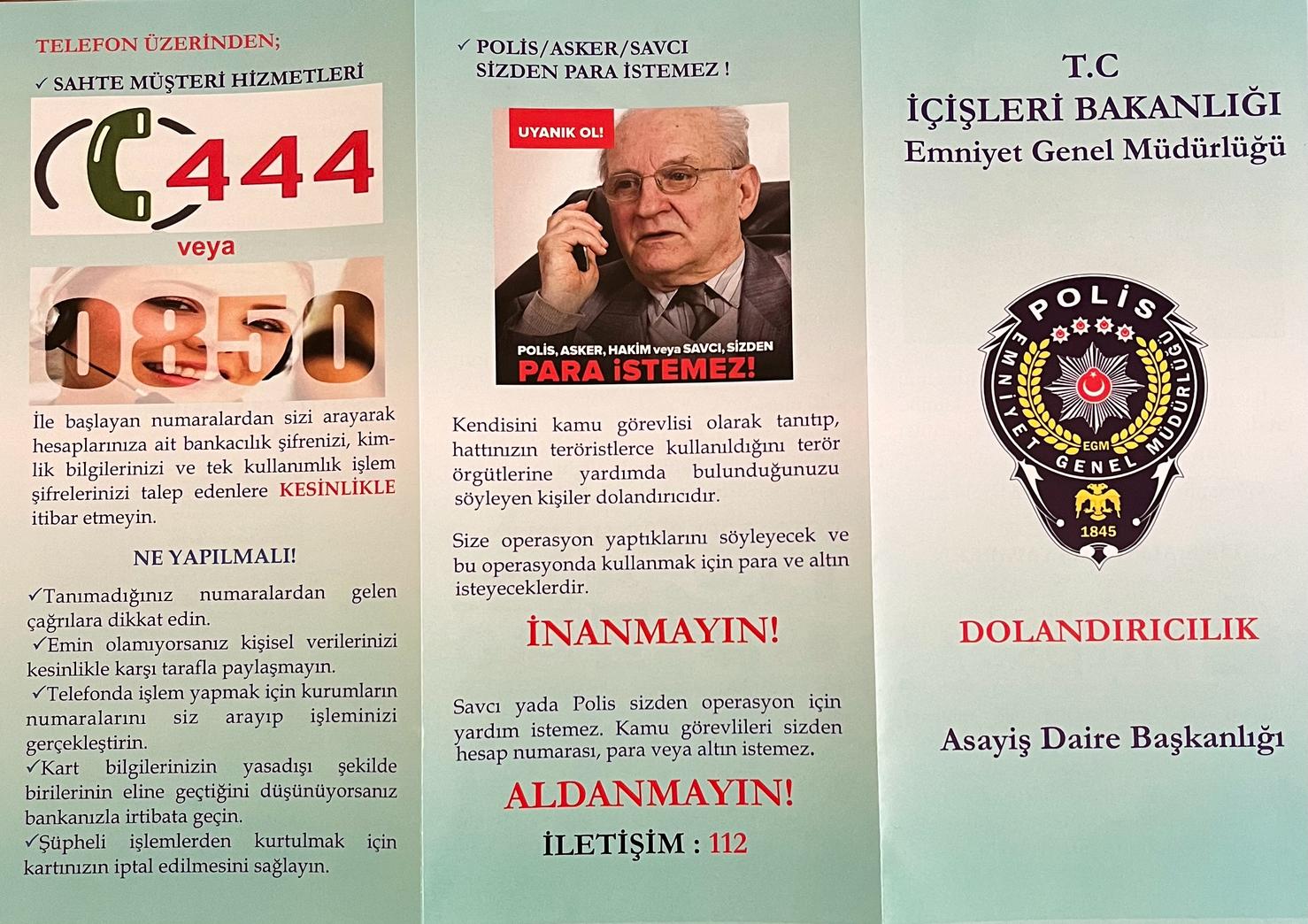 ve Asayiş Daire Başkanlığı tarafından gönderilen Dolandırıcılık konulu 542 adet broşür dağıtılmıştır.