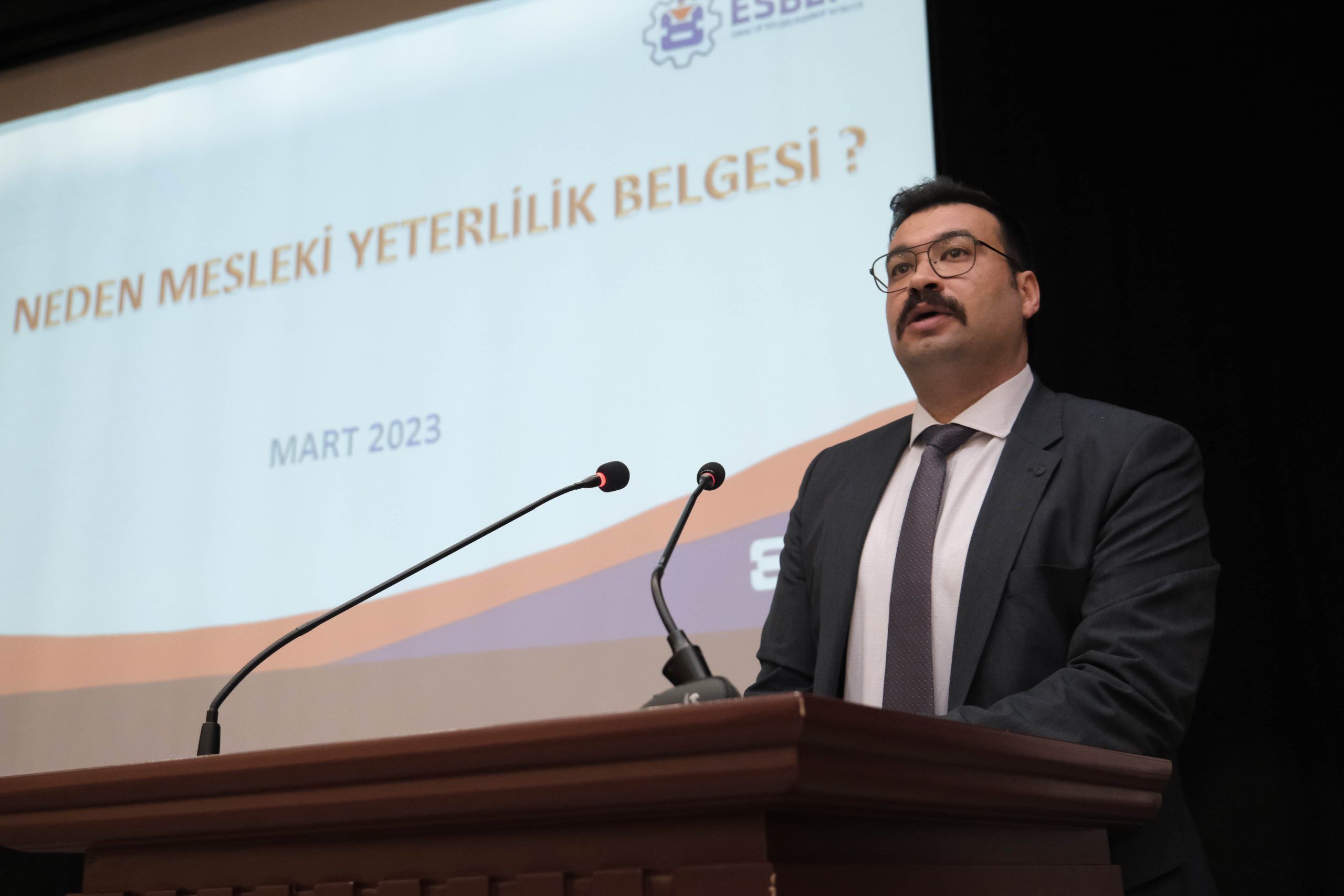 Konuşmanın ardından ESBEM Sınav ve Belgelendirme Merkezi Direktörü Aytekin Sayal, MYK onaylı mesleki yeterlilik belgesinin firmalara sağladığı avantajlar, ustalık belgesi ile MYK belgesi arasındaki farklar, MYK sınav mevzuatı hakkında katılımcılara bir sunum yaparak, katılımcıların sorularını yanıtladı.