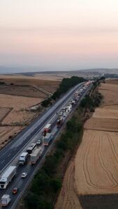 Tonajlı araçların ilerlemesi nedeniyle trafik belirli aralıklarda durma noktasına gelirken, sürücüler ise duruma tepki gösterdi. Uzun kuyrukların oluştuğu karayolunda sürücüler dakikalarca beklemek zorunda kaldı.