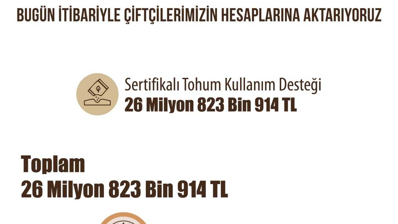 Devletimiz her zaman çiftçisinin yanındadır. Sertifikalı Tohum Kullanım Desteği kapsamında 5.325 üreticimize yapılan 26 Milyon 823 Bin 914 Liralık ödeme çiftçilerimize hayırlı bereketli olsun” dedi.