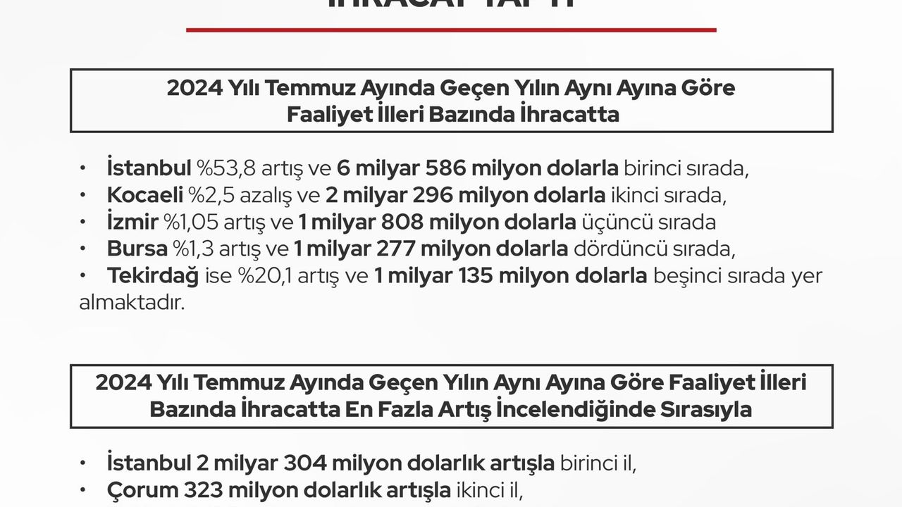 2024 yılı temmuz ayında geçen yılın aynı ayına göre faaliyet illeri bazında ihracatta en fazla artış incelendiğinde de sırasıyla; İstanbul 2 milyar 304 milyon dolarlık artışla birinci il, Çorum 323 milyon dolarlık artışla ikinci il, Tekirdağ 190 milyon dolarlık artışla üçüncü il, Sakarya 153 milyon dolarlık artışla dördüncü il, Eskişehir ise 76 milyon dolarlık artışla beşinci il konumuna oldu.
