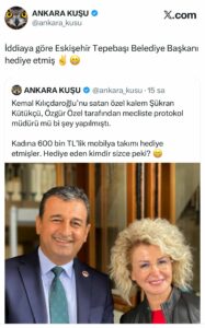 Türkiye’de bilinen bir Sosyal Medya hesabından;CHP’nin eski genel başkanı Kemal Kılıçdaroğlu'nun Özel Kalem Müdürü Şükran Kütükçüye,Tepabaşı Belediye Başkanı tarafından 600.000 TL değerinde mobilya takımının hediye edildiği iddia edildi.
