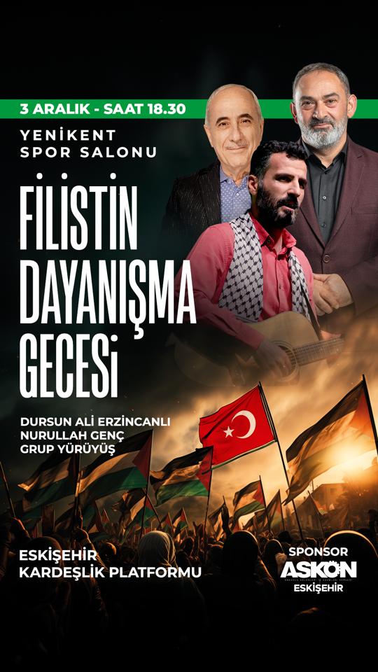 Eskişehir Kardeşlik Platformu tarafından yapılan açıklamada" Filistin Dayanışma Gecesi" nde Dursun Ali Erzincanlı, Nurullah Genç ve Grup Yürüyüş Eskişehir'lilerle buluşacak