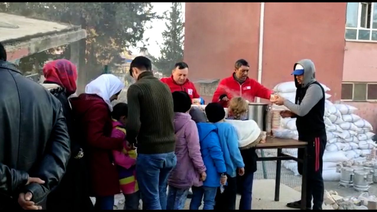 Kızılay uzman ekibinden oluşan gönüllüler, depremzede vatandaşlara yönelik yemek ikramında bunuyor.
