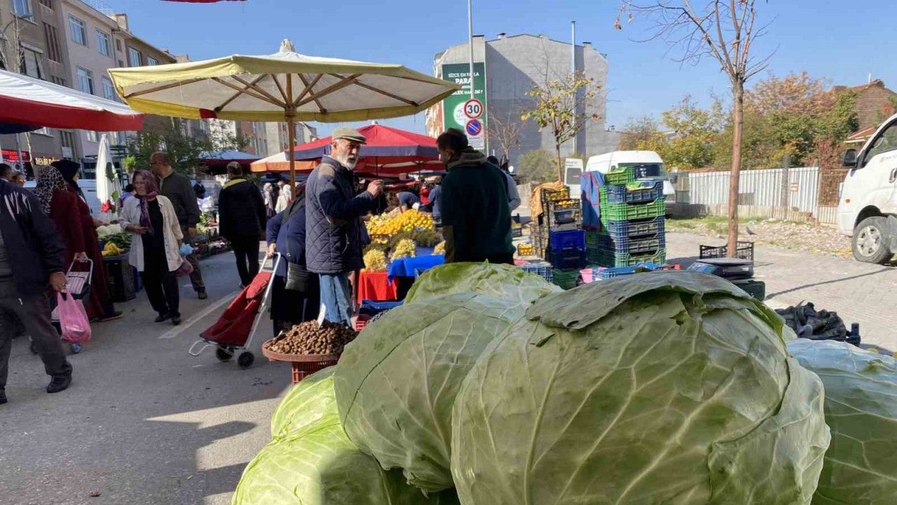 Eskişehir’de pazar tezgahlarında yer alan 11 kiloluk devasa lahanalar vatandaşlar tarafından ilgi görüyor.