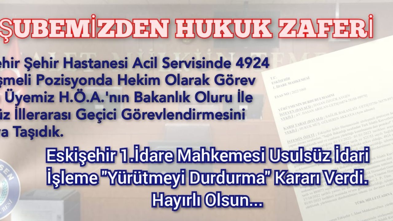 18 Ağustos 2022 tarihinde sağlık gündemine ait basın toplantımızda "Avukat Ordumuzla İdarelerin Her Yaptığı Yanlışa Savaş Açacağız, Dava Açacağız" sözümüz havada kalmadı ve karar veren Eskişehir 1. İdare Mahkemesi usulsüz iller arası geçici görevlendirmeye dur dedi.