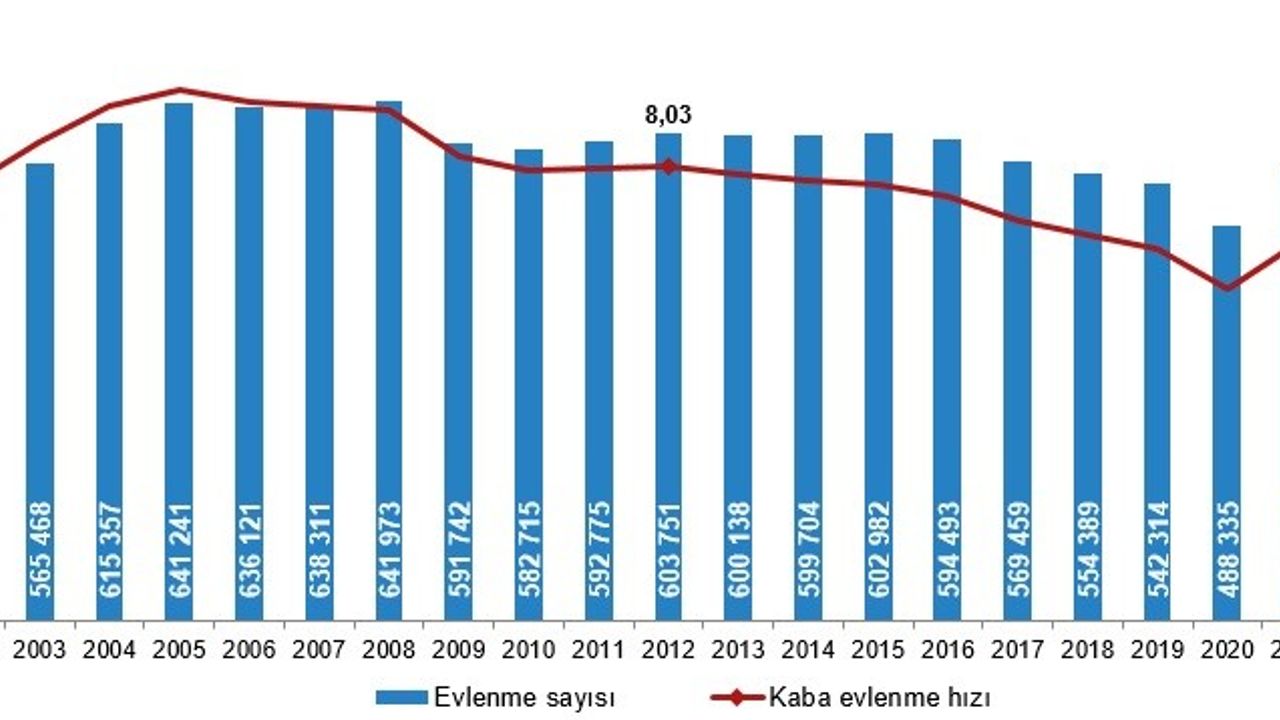 TÜİK hem Türkiye geneli hem de illerle ilgili 2023 yılına ait evlenme ve boşanma istatistiklerini paylaştı. Yayınlanan verilere göre, evlenen çiftlerin sayısı 2022 yılında 575 bin 891 iken, 2023 yılında 565 bin 435 oldu. Bin nüfus başına düşen evlenme sayısını ifade eden kaba evlenme hızı 2023 yılında binde 6,63 olarak gerçekleşti.