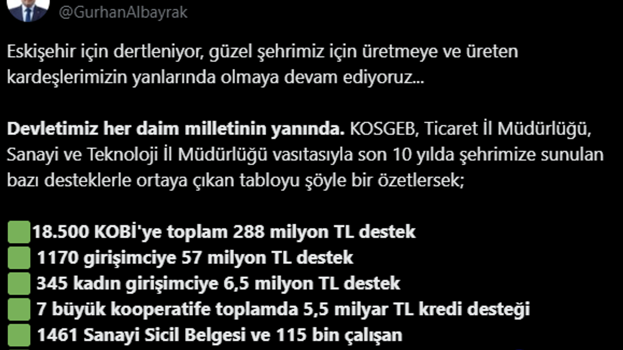 AK Parti İl Başkanı Gürhan Albayrak, KOSGEB, Ticaret İl Müdürlüğü ile Sanayi ve Teknoloji İl Müdürlüğü vasıtasıyla son 10 yılda Eskişehir'e sunulan desteklerle ortaya çıkan istatistiklerle ilgili bilgi paylaştı. Albayrak'ın sosyal medya hesabından açıkladığı bilgilere göre; 18 bin 500 KOBİ'ye toplam 288 milyon TL, bin 170 girişimciye 57 milyon TL, 345 kadın girişimciye 6,5 milyon TL ve 7 büyük kooperatife toplamda 5,5 milyar TL kredi desteği verildi.