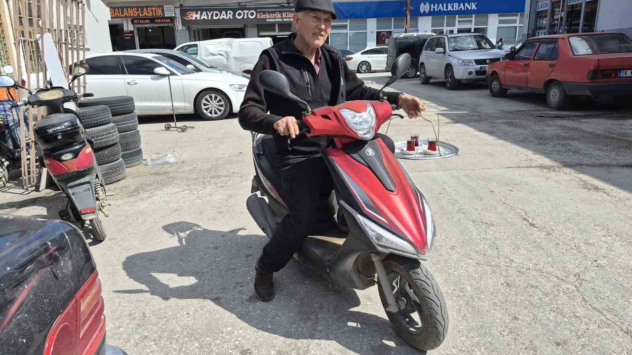 Eskişehir'de 44 senedir çay ocağı işleten 72 yaşındaki Cahit Çandemir, bir eline çay bardaklarıyla dolu tepsiyi alıp, diğer eliyle kullandığı elektrikli motosikleti ile dağıtım yapıyor.