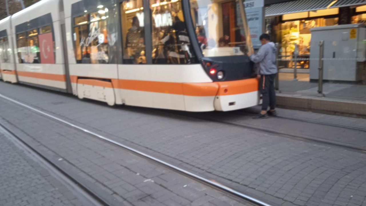 Eskişehir’de bir çocuğun, duraktan hareket etmeye hazırlanan tramvayın arka kısmına tutunma görüntüsü tepki çekti.