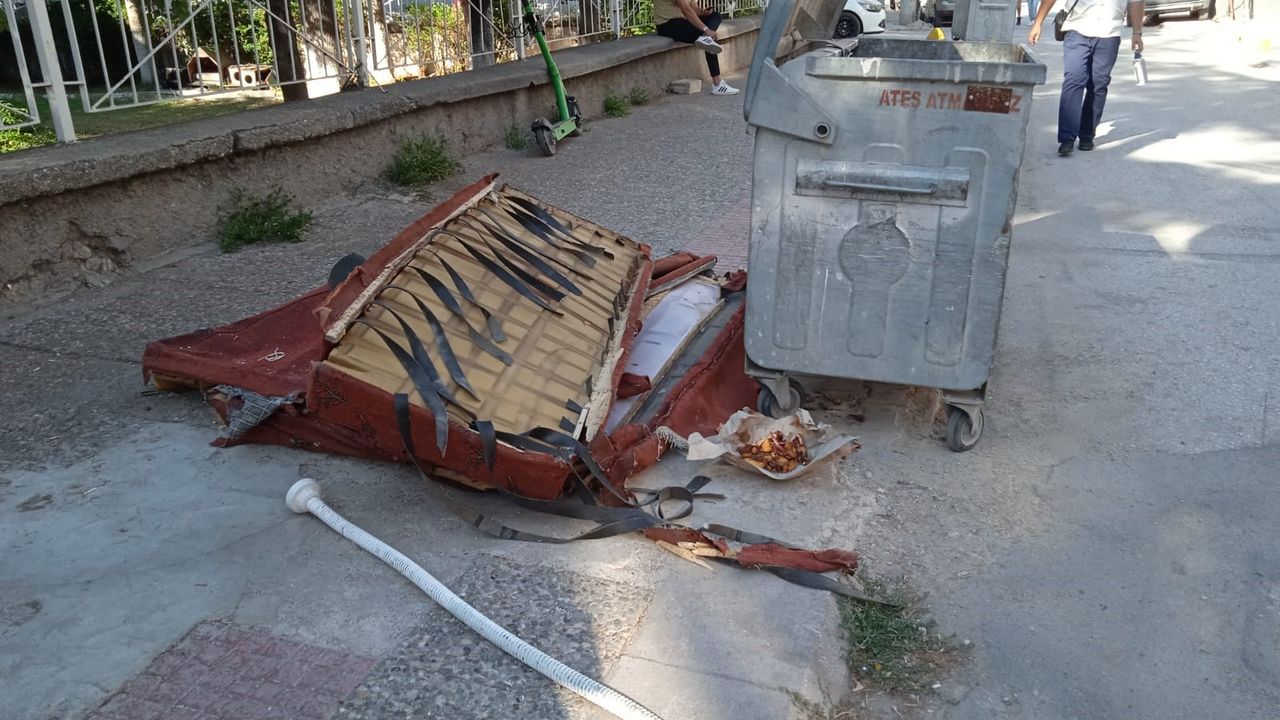 Eskişehir’de bir vatandaşın kanepeyi parçalayarak sokakta bulunan çöp konteynerinin kenarına atması pes dedirtti.
