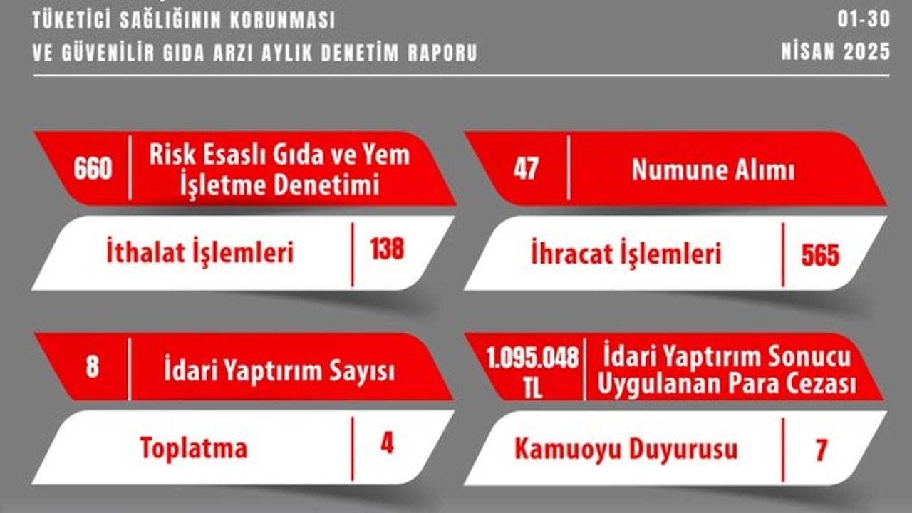 Eskişehir İl Tarım ve Orman Müdürlüğü Gıda ve Yem Şube Müdürlüğü tarafından 1-30 Nisan tarihlerinde denetimler gerçekleştirildi. Tüketici Sağlığının Korunması ve Güvenilir Gıda Arzı Aylık Denetim Raporu kapsamında; 660 adet risk esaslı gıda ve yem işletme denetimi, 138 adet ithalat işlemleri, 565 adet ihracat işlemleri, 47 adet numune alımı yapıldı. Denetimler çerçevesinde ayrıca 8 adet idari yaptırım, 4 adet toplatma, 1 faaliyet durdurma, 3 imha kararı ve 7 kamuoyu duyurusu gerçekleştirildi. İdari yaptırımlar sonucu işletmelere toplam 1 milyon 95 bin 48 TL para cezası uygulandı.