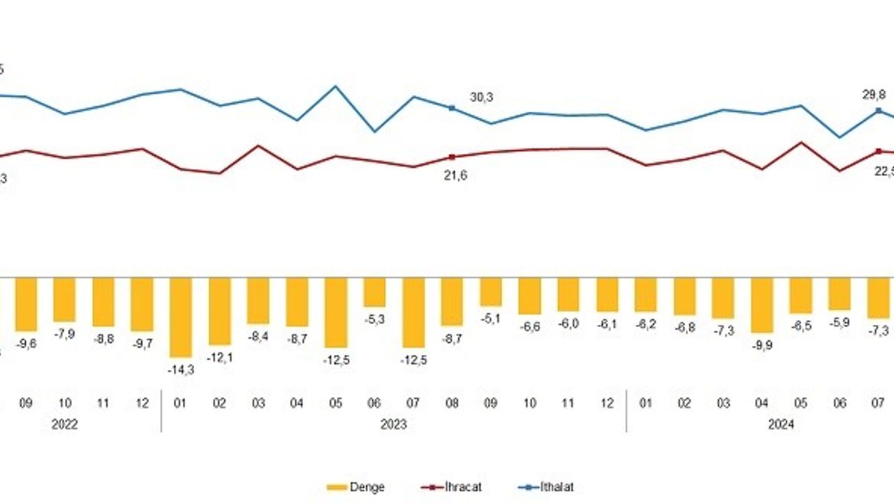 TÜİK ile Ticaret Bakanlığı iş birliğiyle genel ticaret sistemi çerçevesinde üretilen geçici dış ticaret verileri açıklandı. Yayınlanan 'Dış Ticaret İstatistikleri, Ağustos 2024' verilerine göre; yurt genelinde ihracat 2024 yılı Ağustos ayında bir önceki yılın aynı ayına göre yüzde 2,3 artarak 22 milyar 48 milyon dolar, ithalat da yüzde 10,7 azalarak 27 milyar 40 milyon dolar olarak gerçekleşti.