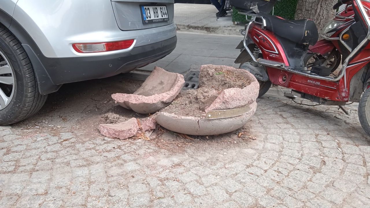 Eskişehir’de dikkatsiz bir kadın sürücünün çarparak kırdığı beton saksı, bu kez başka bir sürücünün hedefi olurken, içindeki bitkilerin ortadan kaybolması merak oluşturdu.