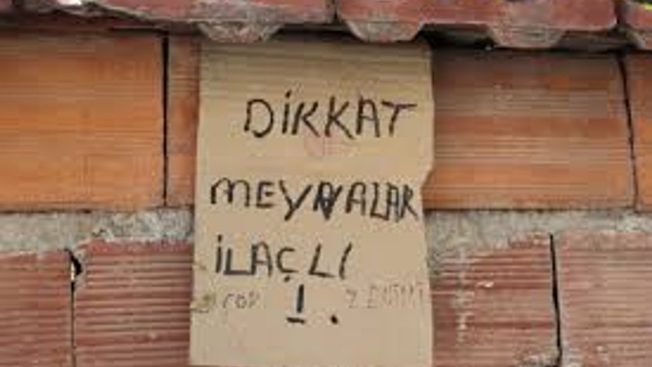 Ancak bahçe duvarına asılan el yazısı tabela, görenleri hem şaşırtıyor, hem de düşündürüyor. Bahçe sahibinin, "Dikkat meyveler ilaçlı, çok zehirli" yazısını, ağaçtan meyve koparılmasını engellemek amacıyla astığı şeklinde yorumlanıyor.