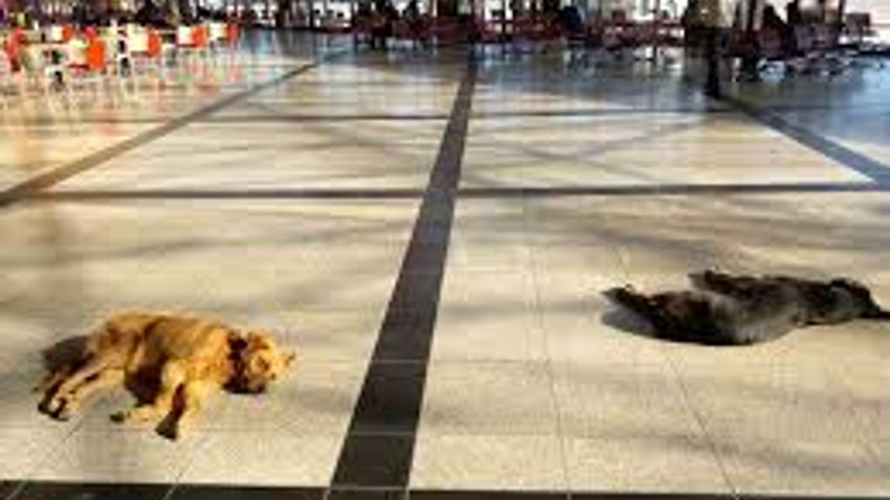 Eskişehir'de bazı sokak köpekleri, hava sıcaklıklarının düşük olması nedeniyle ısınmak için Eskişehir Şehirlerarası Otobüs Terminali binasına sığınıyor.