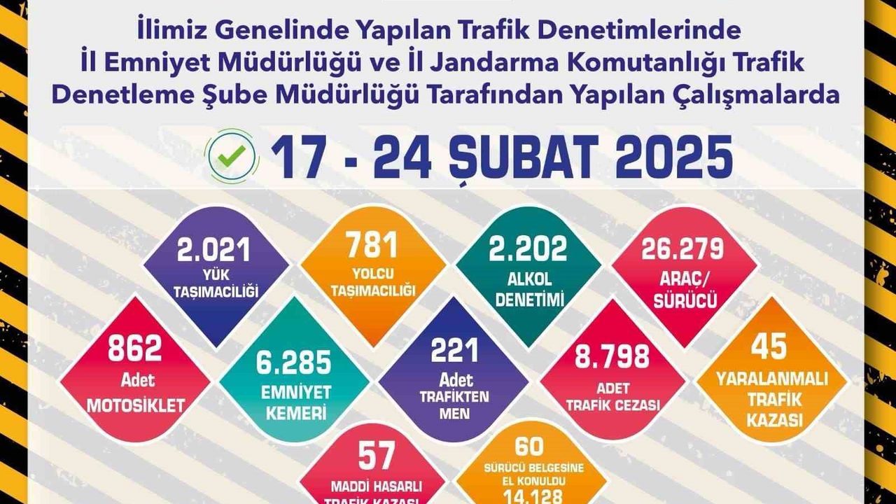 Edinilen bilgilere göre, İl Emniyet Müdürlüğü ve İl Jandarma Komutanlığı Trafik Denetleme Şube Müdürlüğü ekiplerince trafik denetimleri yapıldı. Kent genelinde 17-24 Şubat 2025 tarihleri arasında yapılan denetimlerde; 2 bin 21 yük taşımacılığı, 781 yolcu taşımacılığı, 2 bin 202 alkol denetimi, 862 adet motosiklet, 6 bin 285 emniyet kemeri ve 14 bin 128 diğer kontrol türleri gerçekleştirildi. Ekiplerce toplam 26 bin 279 araç ve sürücü denetlenirken, 8 bin 798 trafik cezası kesilip, 221 araç trafikten men edildi ve 60 sürücü belgesine el konuldu. Ayrıca, çalışmalar sırasında ekiplerce 45 yaralanmalı ve 57 maddi hasarlı trafik kazasına müdahalede bulunuldu.