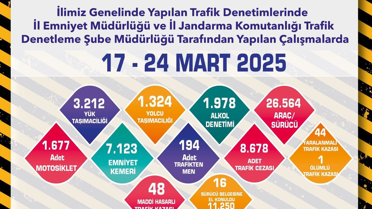 Edinilen bilgilere göre, İl Emniyet Müdürlüğü ve İl Jandarma Komutanlığı ekiplerince trafik denetimleri yapıldı. Kent genelinde 17-24 Mart 2024 tarihleri arasında yapılan denetimlerde; 3 bin 212 yük taşımacılığı, bin 324 yolcu taşımacılığı, bin 978 alkol denetimi, bin 677 motosiklet, 7 bin 123 emniyet kemeri ve 11 bin 250 diğer kontrol türleri gerçekleştirildi. Toplam 26 bin 564 araç ve sürücünün denetlendiği çalışmalar sonucunda 8 bin 678 adet trafik cezası yazılırken, 194 adet trafikten men yapıldı ve 16 sürücü belgesine el konuldu.