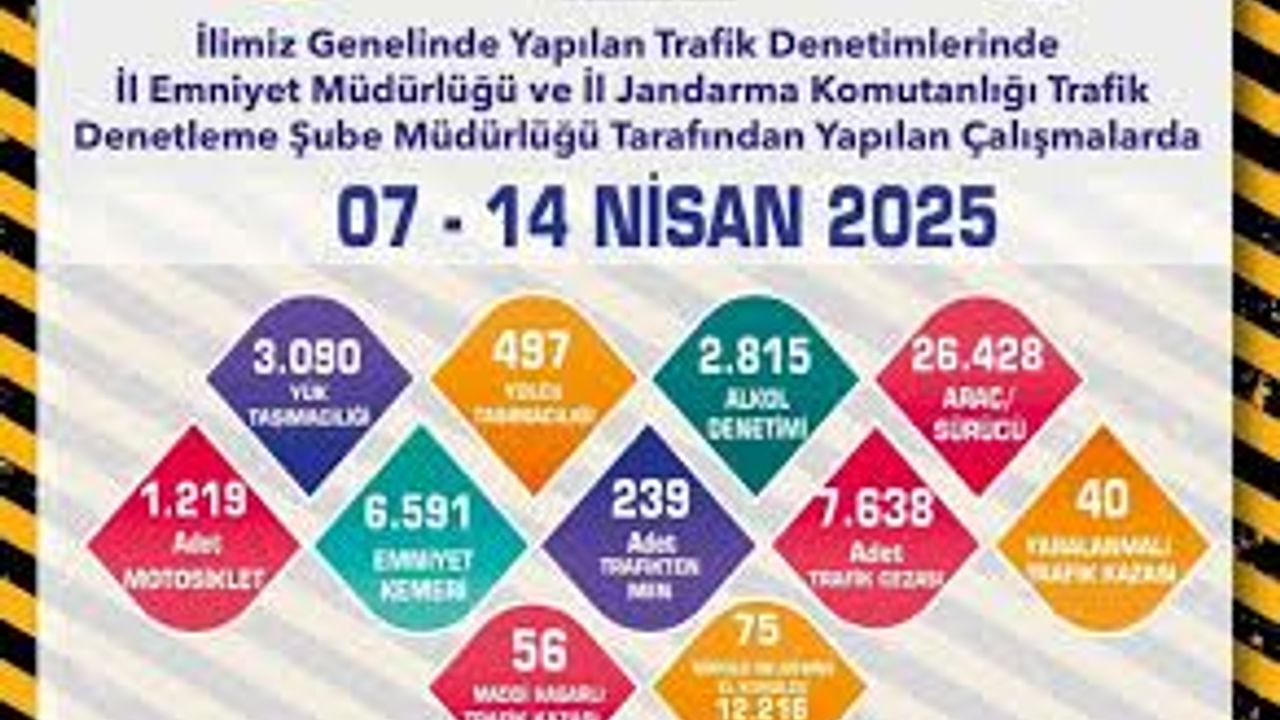 Edinilen bilgilere göre, İl Emniyet Müdürlüğü ve İl Jandarma Komutanlığı Trafik Denetleme Şube Müdürlüğü ekiplerince denetim yapıldı. Kent genelinde 7-14 Nisan 2025 tarihleri arasında yürütülen çalışmalarda; 3 bin 90 yük taşımacılığı, 497 yolcu taşımacılığı, 2 bin 815 alkol denetimi, bin 219 motosiklet, 6 bin 591 emniyet kemeri ve 12 bin 216 diğer kontrol türleri gerçekleştirildi. Ekiplerin 26 bin 428 aracın kontrol ettiği denetimler sonucunda 7 bin 638 adet trafik cezası kesilirken, 239 araç trafikten men edildi ve 75 sürücü belgesine el konuldu.