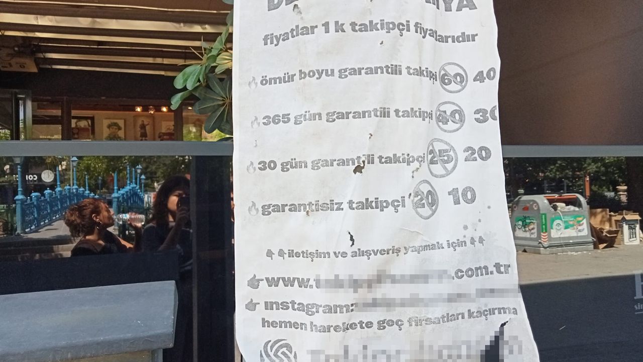 Eskişehir Adalar'da elektrik direğinde asılı olan afişte, sosyal medya platformlarında takipçi satın alma hizmeti olduğu iddia edildi. Dikkat çeken bu görsel, sosyal medya platformlarında takipçi satın almanın yaygınlaştığını ve sokaklara afiş asılacak kadar çok talep gördüğünü gözler önüne serdi.