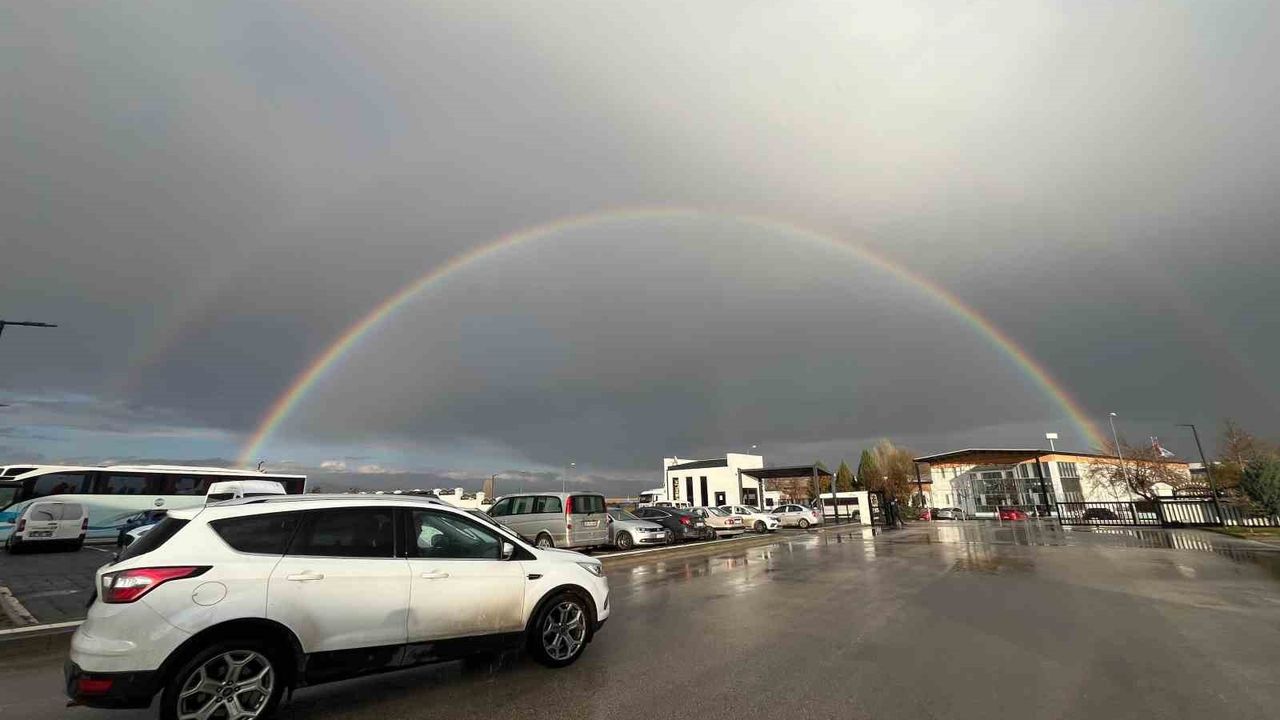 Eskişehir’de sabah saatlerinden beri etkili olan yağışlı havanın ardından ortaya çıkan rengarenk gökkuşağı manzarası, Eskişehirliler tarafından ilgiyle izlendi.