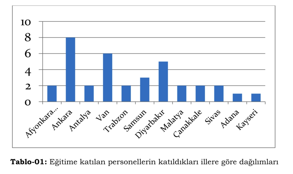 Eskişehir İAS eğitim salonlarında 2 farklı oturum olarak planlanan eğitime; Afyonkarahisar (2), Ankara (8), Antalya (2), Van (6), Trabzon (2), Samsun (3), Diyarbakır (5), Malatya (2), Çanakkale (2), Sivas (2), Adana (1) ve Kayseri (1) illerinden 22 Doktor ve 14 Hava Operasyon Sağlık Personeli olmak üzere toplam 36 personel katılmıştır. Personellerin illere göre dağılımı Tablo-01’de verilmiştir.