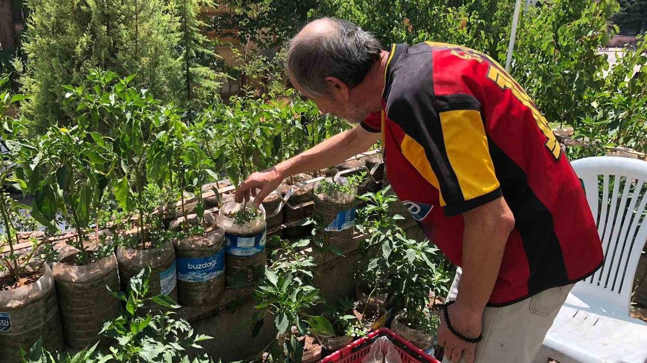 Eskişehirli Salim Pektaş, iş yerinin balkonunu sebze bahçesine dönüştürerek hem geri dönüşüm yapıyor hem de doğal ürün ihtiyacını karşılıyor.