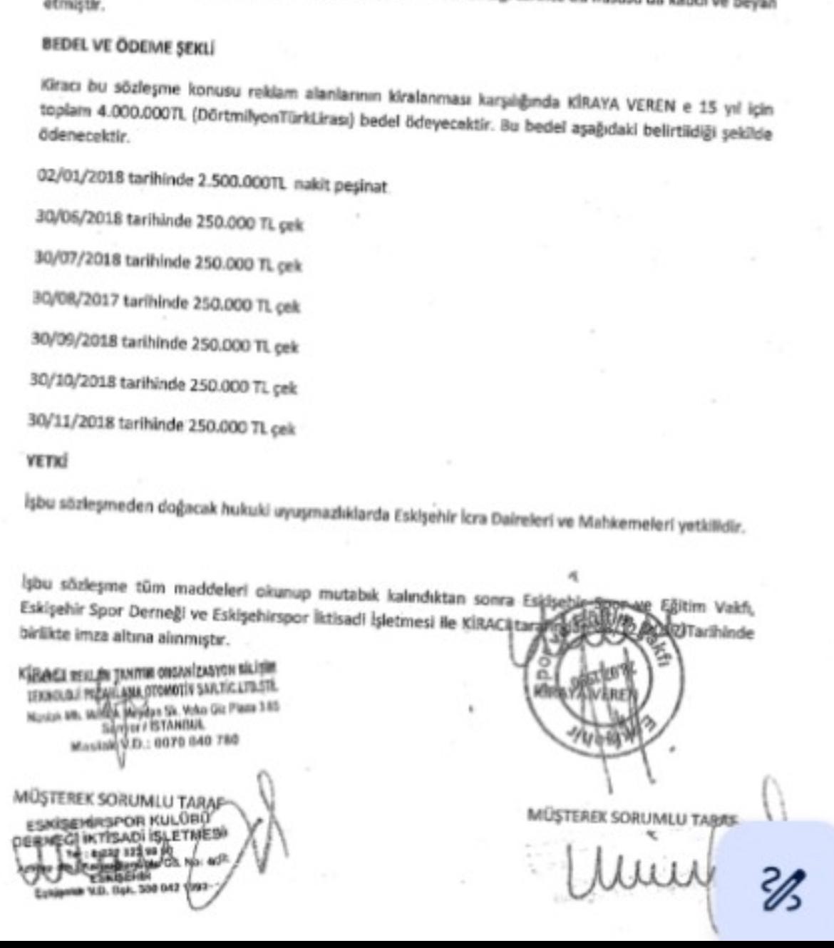 Aynı gün 28 Aralık 2017 tarihinde,Eskişehir Spor Eğitim Vakfı da ADARGA isimli bir firma ile sözleşme imzalayarak Odunpazarı Belediyesinin terk ettiği bütün menfaatlerini daha ağır şartlarla şirkete devrediyor. Vakfın dolayısı ile Odunpazarı Belediyesi'nin sorumluluk alanında ki tüm reklam üniteleri,alanları ve 15 yıllık menfaatlerini alan ADARGA isimli firma ilginç iş ilişkileri olan;vakıf ile arasında imzalanan sözleşmeden sadece 2 ay önce İstanbul’da kurulmuş,hiç bir iş deneyimi olmayan bir şirket olarak dikkat çekiyor. Sözleşme Eskişehir Spor Vakfı için ağır tazminatlar içeriyor.♦ Örneğin “Sözleşme herhangi bir şekilde uygulanmaz ise,Odunpazarı Belediyesi'nin tahsisi herhangi fesih edilirse,her hangi bir kamu kurum ve kuruluşunun kararı ile reklam alanları kullanılamaz ise,kiracı bu işi yapamaz hale gelirse tazminat olarak Eskişehirspor TFF 1. Ligde 5,Süper Ligde 4 Yıl forma reklam hakkı (Şort,sırt,kol göğüs) kiracıya(ADARGA) ait olacaktır.Vakıf sözleşmeyi fesh ederse bu madde geçerli olacaktır. Vakıf nakit 2,5 Milyonu peşin geri kalanı 6 taksit toplam 4 Milyon Lira karşılığında bütün menfaatlerini 15 Yıl süresince ADARGA isimli firmaya devrediyor İMZA ATANLARIN İMZA YETKİSİ VARMI BELLİ DEĞİL?Vakıf ile ADARGA arasında ki sözleşme de dört imza bulunuyor.ADARGA,Eskişehirspor Kulübü İktisadi İşletmesi,Eskişehir Spor Eğitim Vakfının kaşeleri ve kaşesiz Müşterek Sorumlu yazan tarafların imzası var.Fakat çok ilginç imza atan kişilerin hiç birinin isimleri yok.