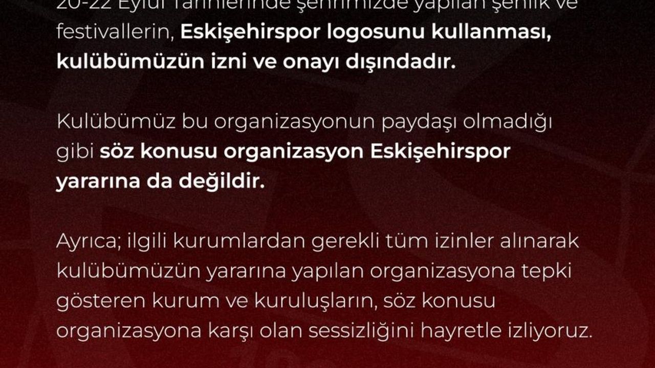 Bu paylaşımda, logo kullanımının kulübün izni ve onayı dışında olduğu açıklanarak, "20-22 Eylül tarihlerinde şehrimizde yapılan şenlik ve festifallerin Eskişehirspor logosunu kullanması kulübüzün izni ve onayı dışındadır. Kulübümüz bu organizasyonun paydaşı olmadığı gibi, söz konusu organizasyon Eskişehirspor yararına da değildir. Ayrıca; ilgili kurumlardan gerekli tüm izinler alınarak kulübümüzün yararına yapılan organizasyona tepki gösteren kurum ve kuruluşların söz konusu organizasyona karşı olan sessizliğini hayretle izliyoruz" ifadelerine yer verildi.