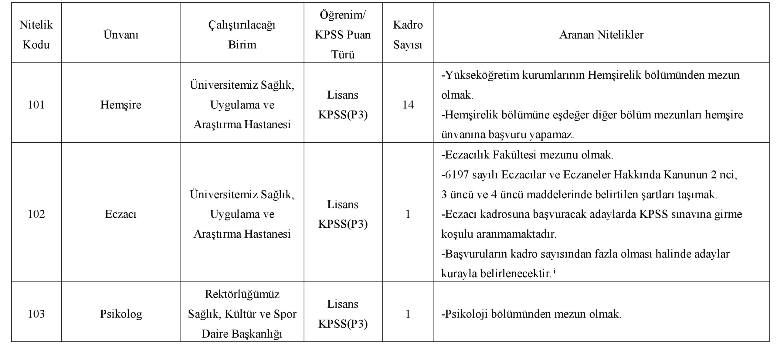 Üniversitemiz Rektörlüğü ve bağlı birimlerinde 657 sayılı Devlet Memurları Kanunu'nun 4 üncü maddesinin B fıkrasına göre istihdam edilmek ve giderleri özel bütçeden karşılanmak üzere 06/06/1978 tarihli ve 7/15754 sayılı Bakanlar Kurulu Kararına ekli "Sözleşmeli Personel Çalıştırılmasına İlişkin Esasların" ek 2 nci maddesinin (b) fıkrasına göre aşağıda belirtilen unvanlarda 2022 yılı KPSS (B) grubu puan sıralamaları esas alınmak suretiyle yazılı ve sözlü sınav yapılmaksızın sözleşmeli personel alınacaktır denildi