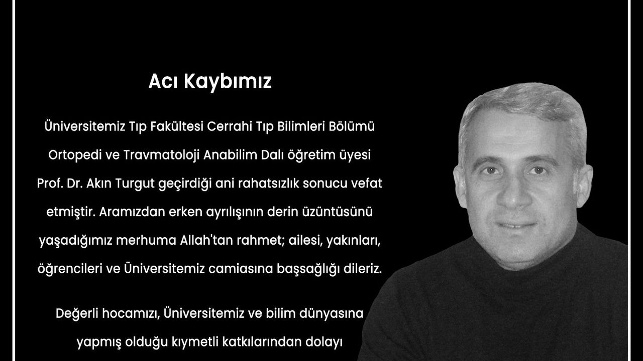 Geçirdiği ani rahatsızlık nedeniyle hayatını kaybeden Prof. Dr. Akın Turgut için görev yaptığı Eskişehir Osmangazi Üniversitesi Tıp Fakültesi Hastanesi’nden taziye mesajı yayınlandı.